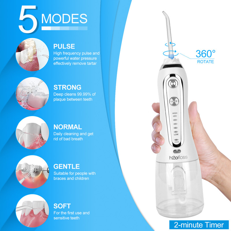 5 Cleaning Modes with Memory Function: The flosser features strong/normal/soft/pulse/child cleaning modes and a low noise design to meet various cleaning needs. The innovative memory function retains your preferred mode for next use.