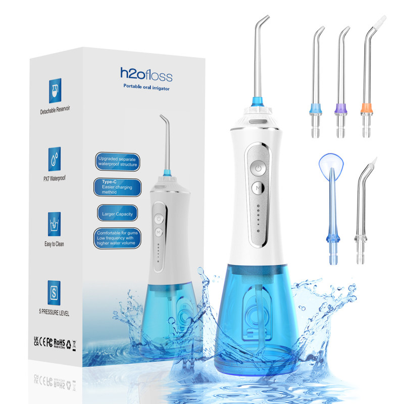 Professional dental flosser featuring IPX7 waterproof rating, UV sterilization function, and adjustable pulse frequency for effective oral care.